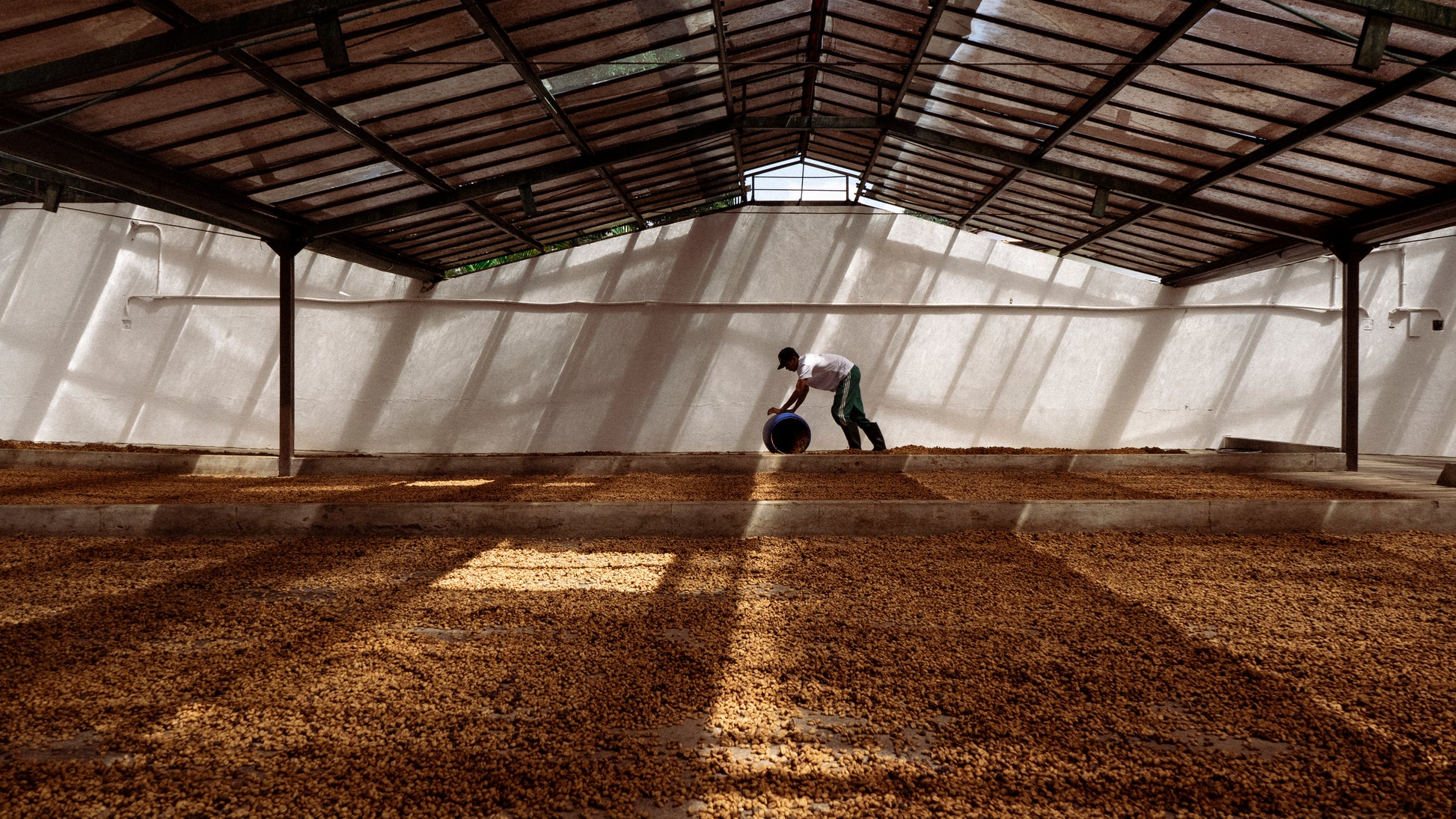 Drying takes place in two carefully managed stages. The first phase occurs under a canopy at a maximum temperature of 40°C and 25% humidity for approximately 20 days. The second phase is completed in a parabolic dryer for around 5 days, with shading to prevent over-drying and ensure even moisture throughout the lot.